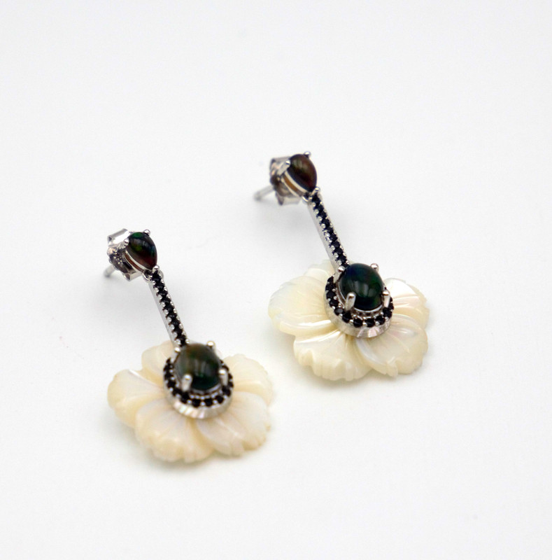Sterling silver black opal, mother of pearl and black spinel earrings