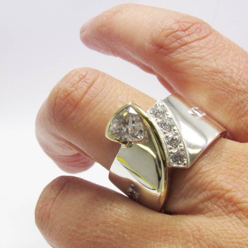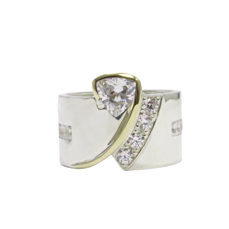 This ring is an absolute show-stopper.. Skayla is custom made with non-tarnish sterling silver and gold and set with a 7mm Trillion AAA Swiss Cubic Zirconia, with 4x 3mm Round AAA Swiss Cubic Zirconia and 8x 2mx3m Baguette Cubic Zirconias.