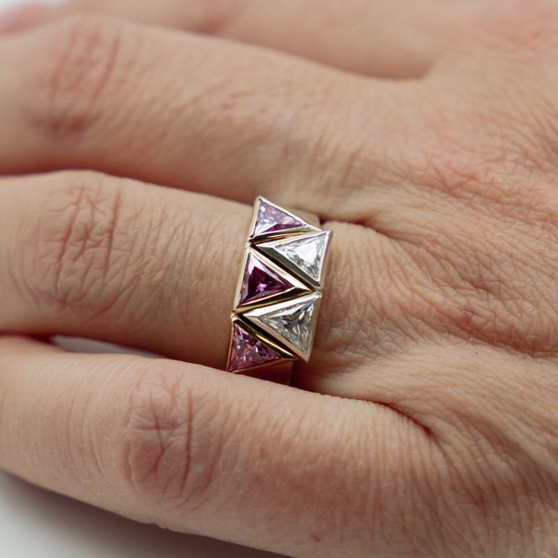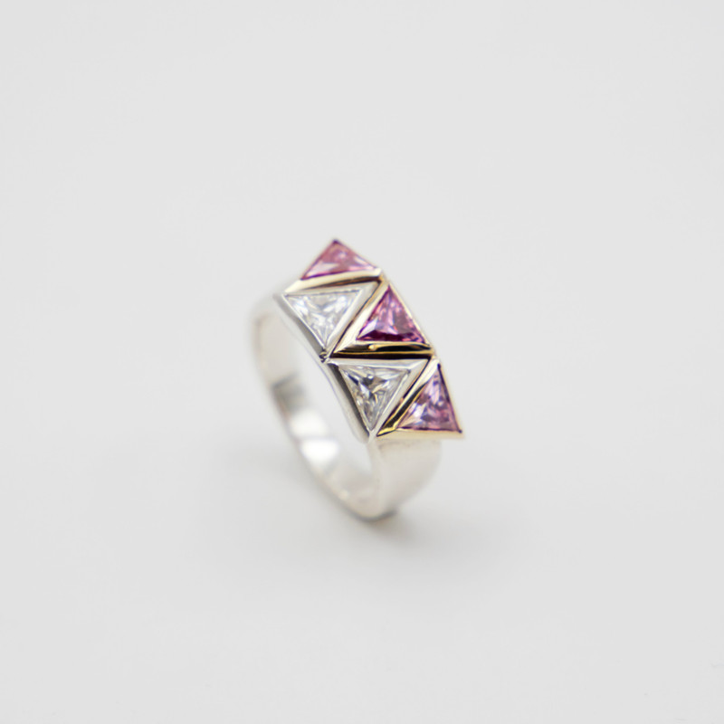 Sterling silver and 9ct yellow gold 5 triangle custom made design ring set beautifully with white moissanites.